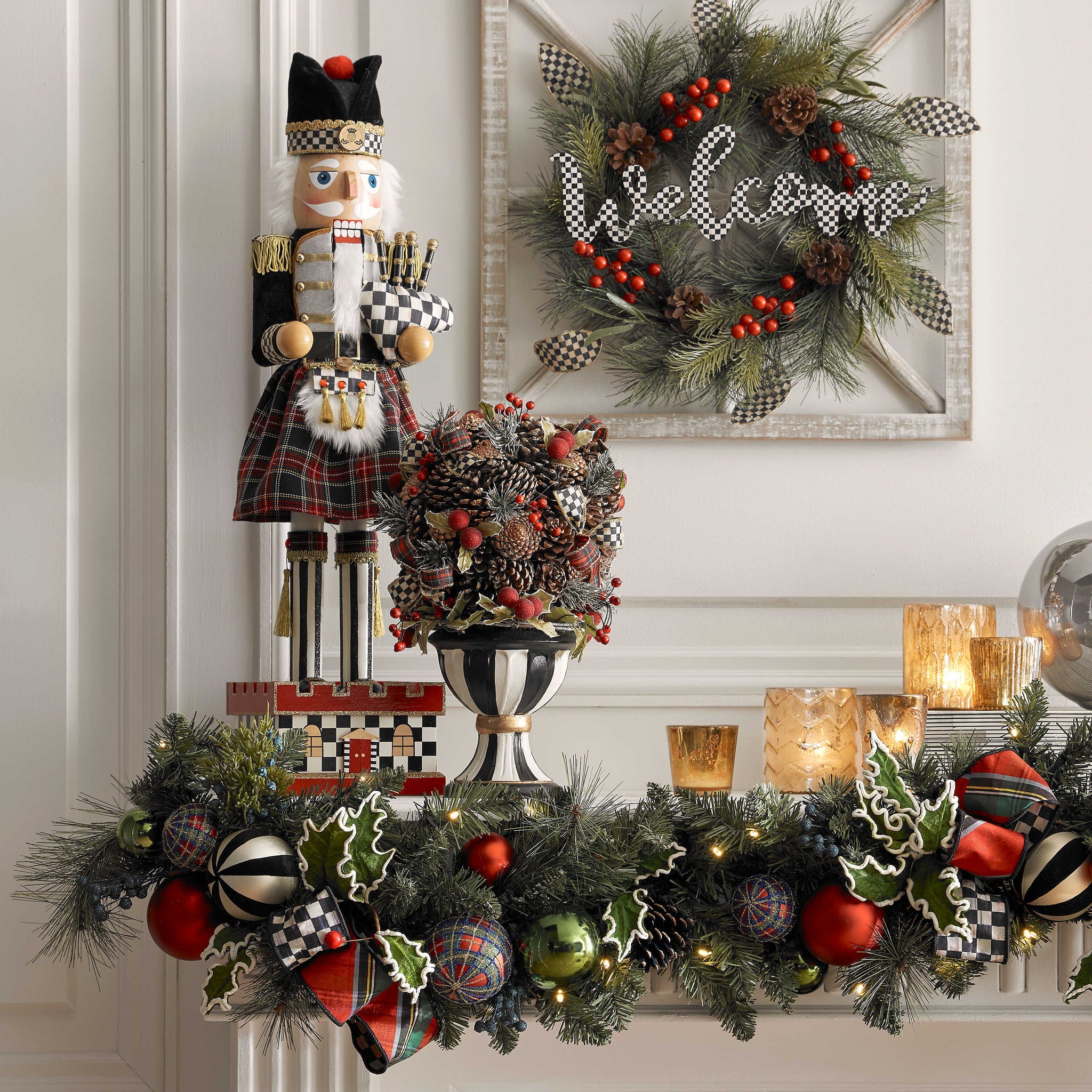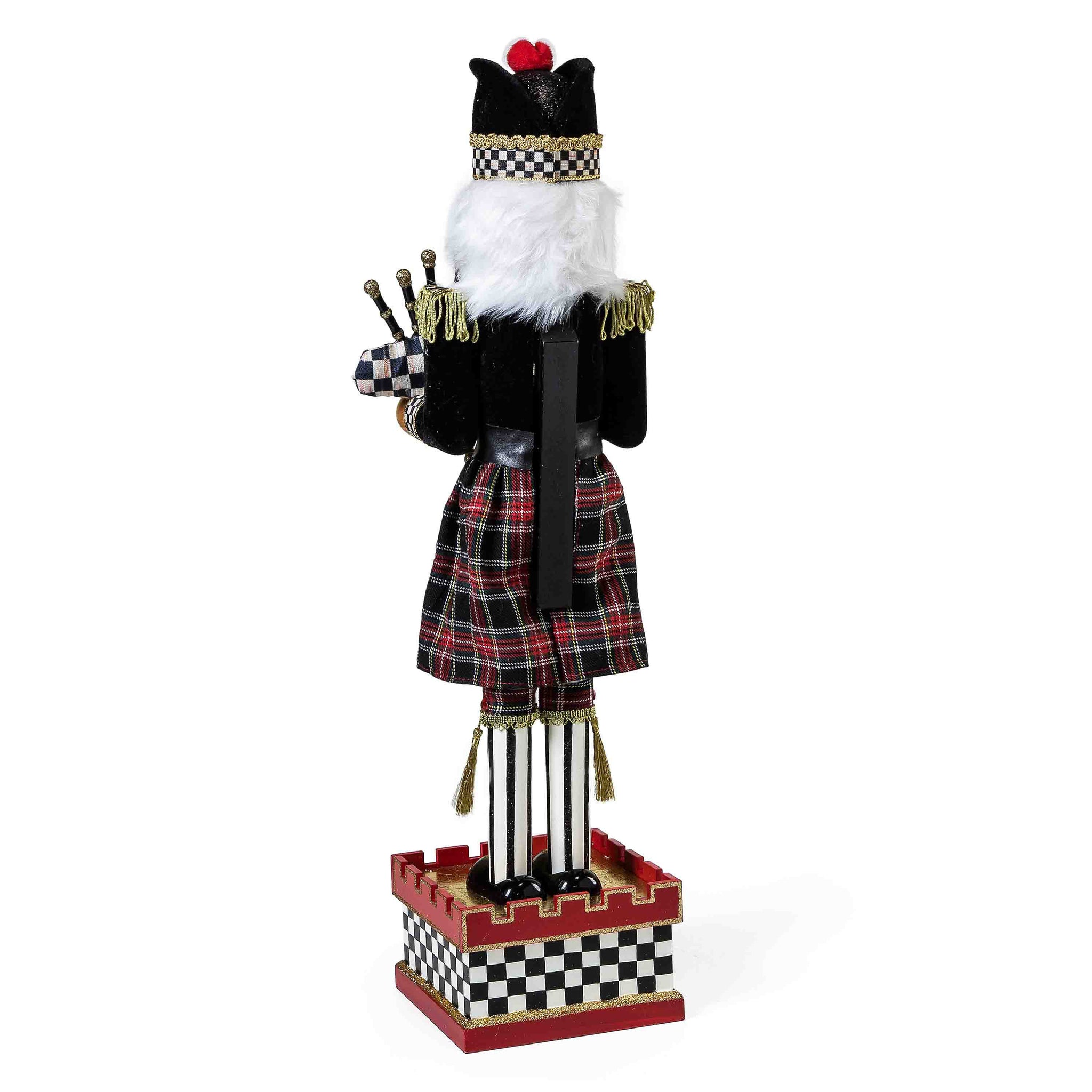Deléitese con los detalles de nuestro cascanueces gaitero de madera pintado a mano. De pie sobre una base de almena, viste un abrigo y una gorra de terciopelo y una falda escocesa de tela de tartán acentuada con un sporran de piel sintética.