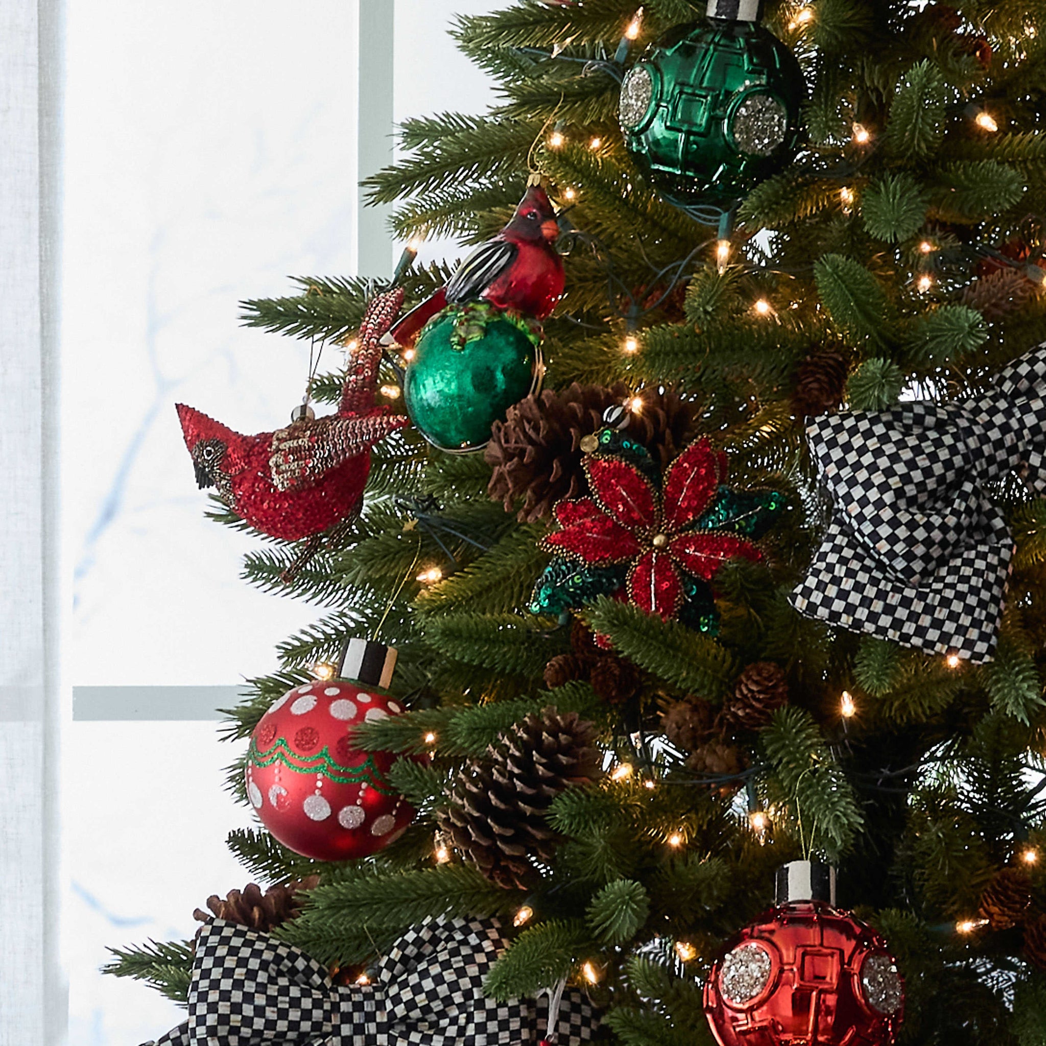Alegrar el árbol con este adorno de flor de pascua con cuentas, que presenta cuentas de vidrio en el frente y tela Courtly Check® en la parte posterior.
