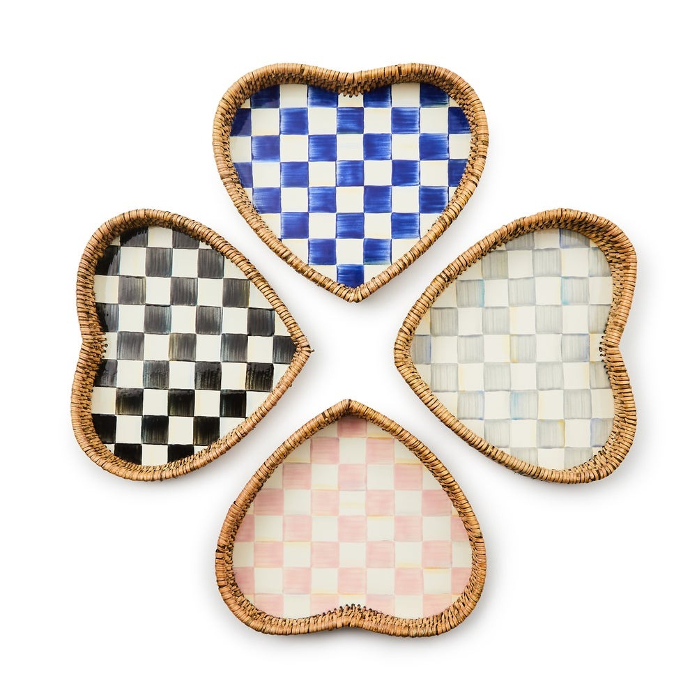 Tan práctica como bonita, la Bandeja de Corazón de Esmalte y Ratán Rosy Check® combina ratán natural tejido con nuestro diseño Rosy Check pintado a mano sobre una base de acero en forma de corazón.